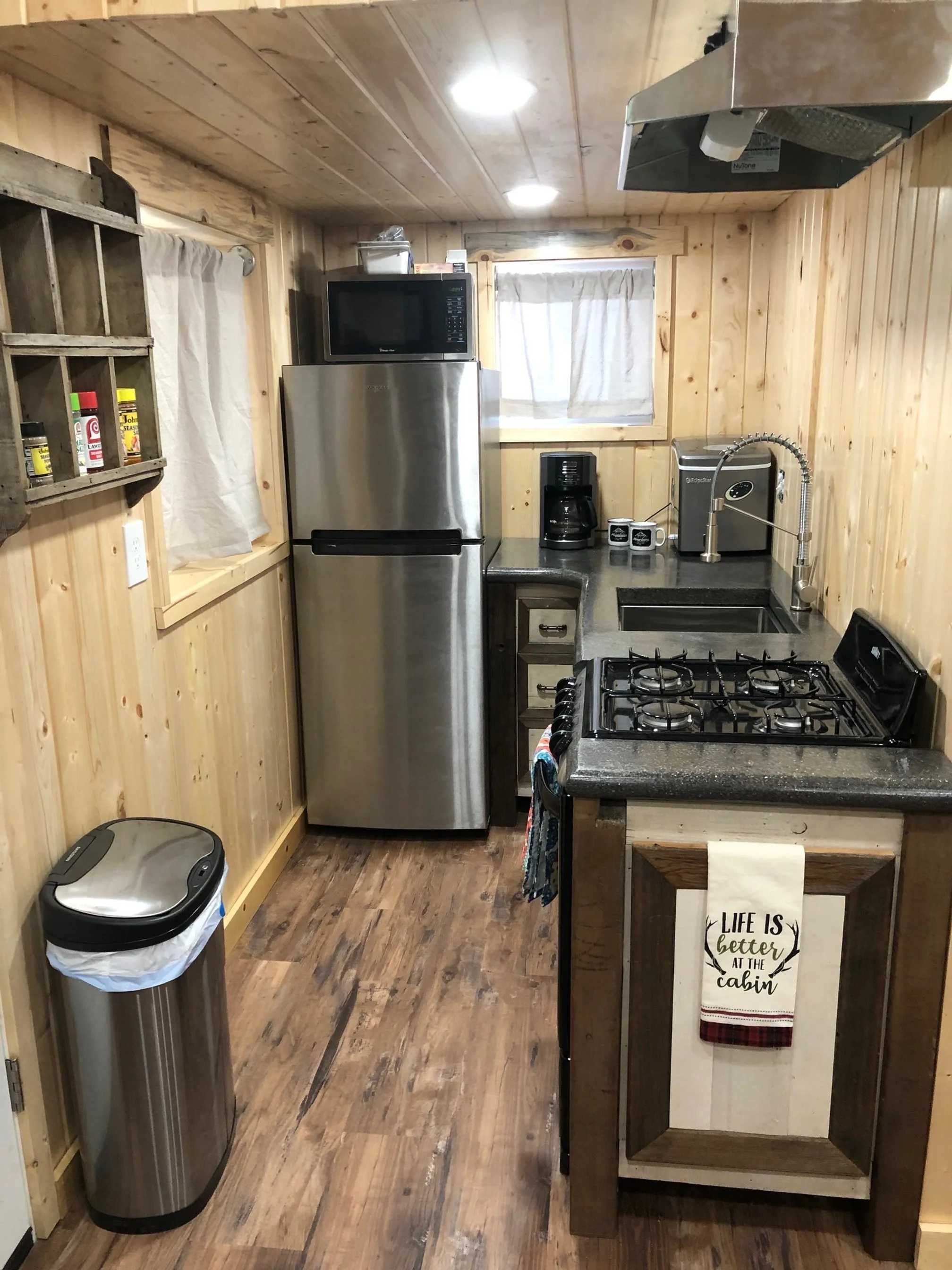 Cabin 1; this cozy queen bed studio offers everything you need: a fireplace, heat and A/C, a fully equipped kitchen, and a 3/4 bathroom. Relax on the screened porch with a queen futon, a dining table, and stunning mount and river views. Cabin 2; a charming secondary unit features a queen bed, ¾ bathroom, microwave, and mini fridge, offering everything you need for a relaxing stay. Together, the cabins offer two families to enjoy the same private amenities but sleep separately.